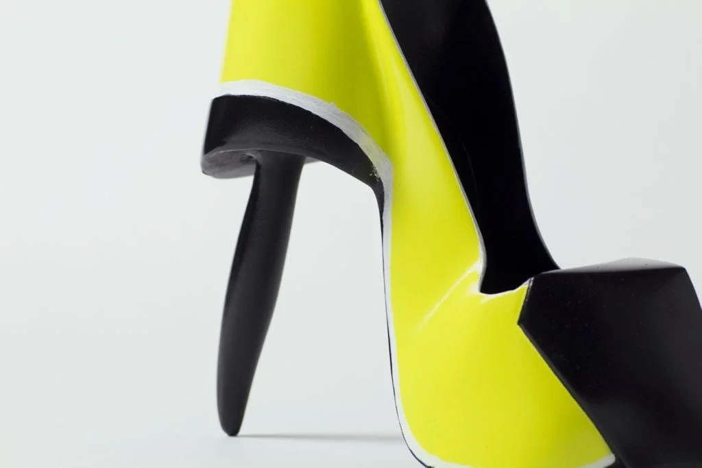 The Hornet SUV concept represented aggressive elegance: a bold stance, tight frame, and aerodynamic styling. I wanted the shoe to echo the very DNA of that —down to the angular silhouette, performance-based proportions, and the punchy, high-contrast color scheme of black and hazard yellow. Even the toe of the heel mimics the aggressive geometry of a bumper, while the stiletto heel forms a functional nod to a Hornet stinger. This wasn’t about fashion for fashion’s sake—it was storytelling in physical form.