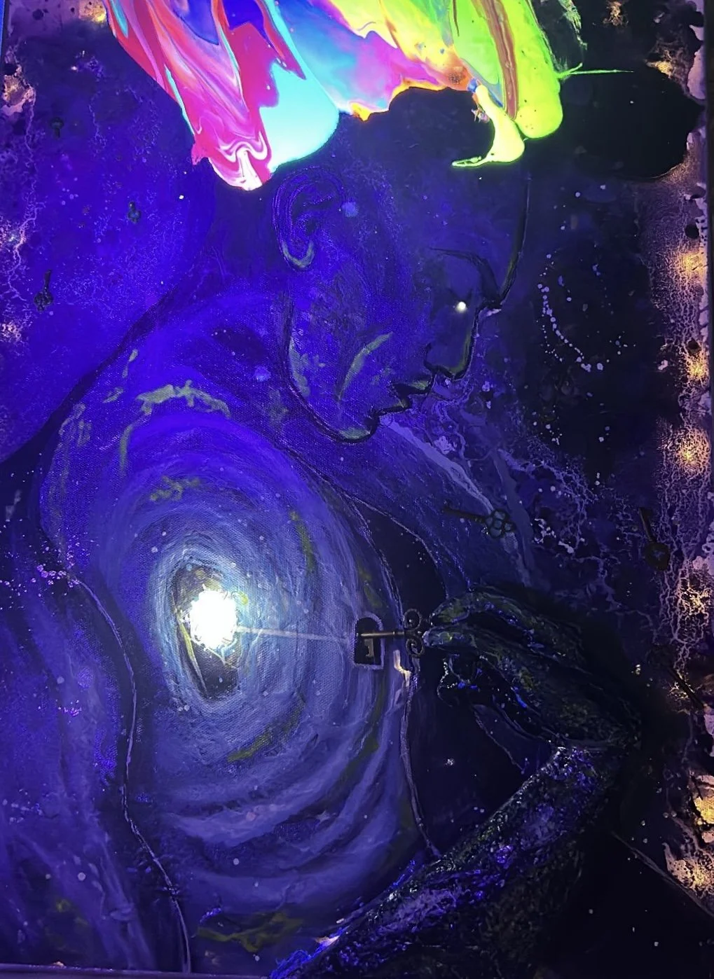 My extended arm, crafted from foam and textured by hand, physically reaches into the canvas—holding the “correct” key. The one meant to unlock my own vortex, revealing the potential I’d carried all along.